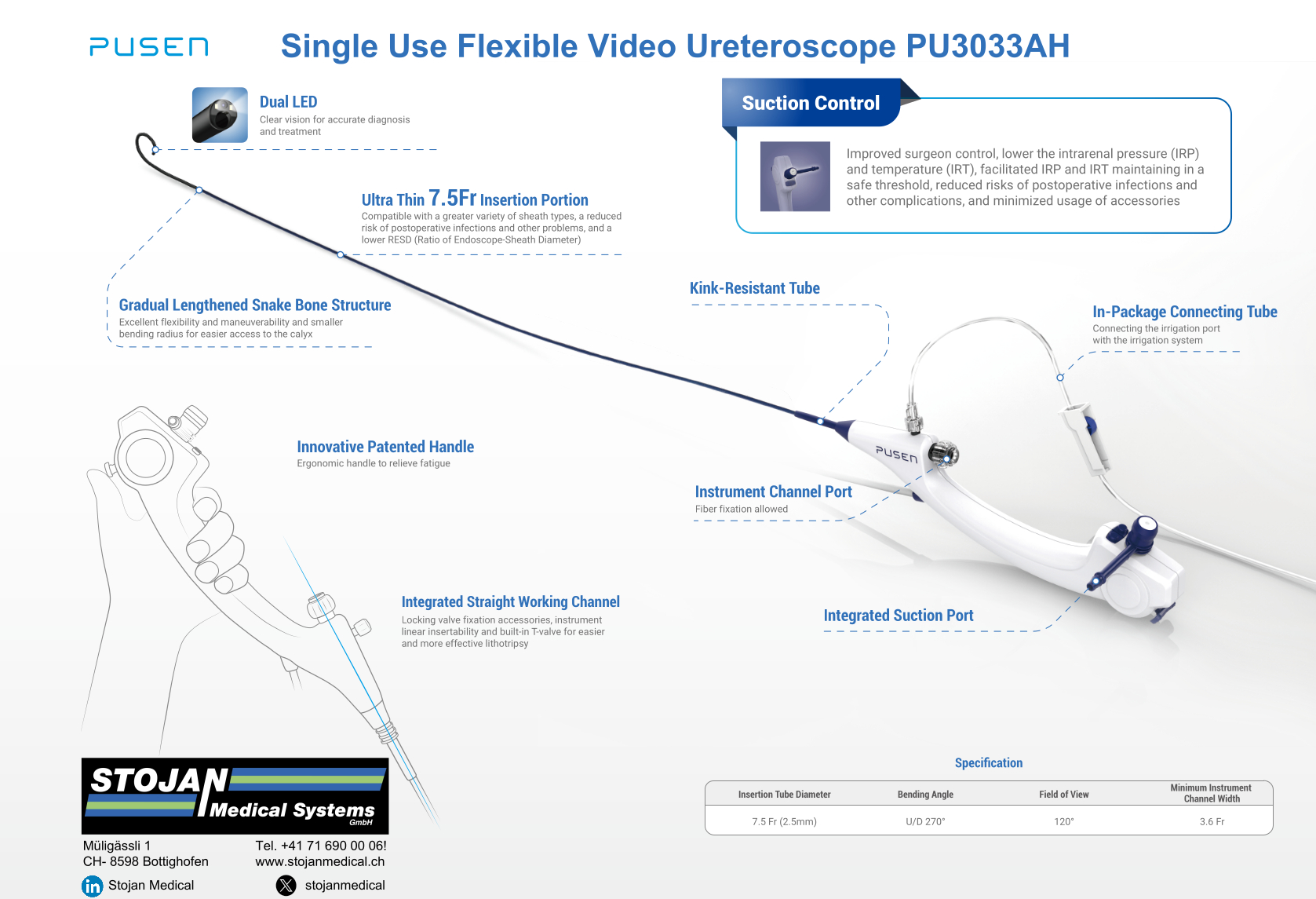 - Integrierte Absaugung: Das URS 7,5 Fr. verfügt über eine präzisionsgesteuerte Absaugung, die während des Eingriffs eine effektive Entfernung von Flüssigkeiten und Steinstaub ermöglicht.